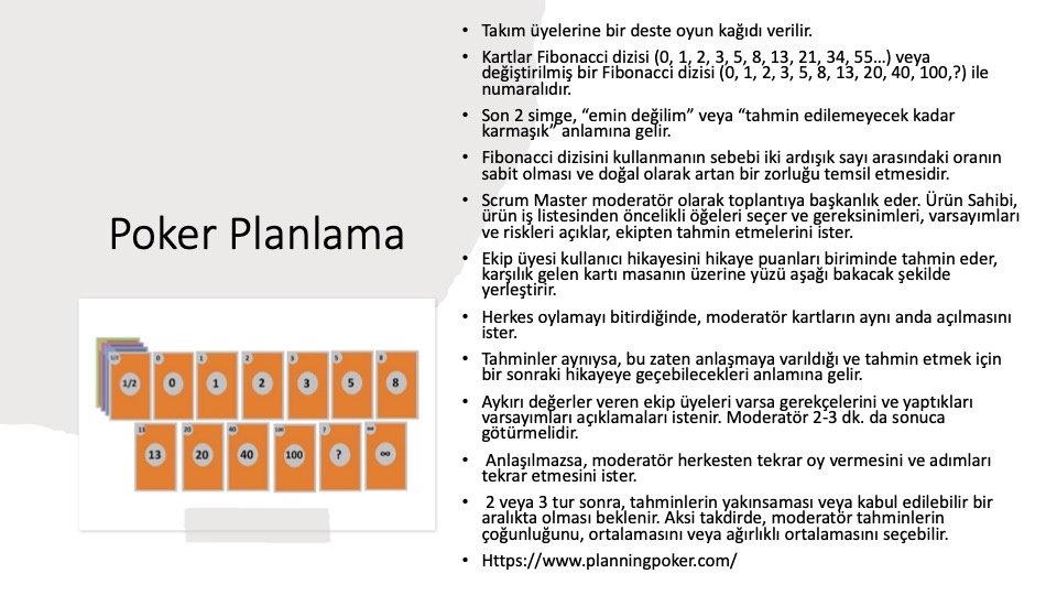 - Göreceli tahmin yöntemine örnek poker planlamadır. Poker planlamada, işi gerçekleştiren proje ekibi, değeri üretmek için gerekli olan çaba (efor) konusunda fikir birliğine varır. İşi tahmin etmek için hikaye noktaları kullanılıyorsa (ör. 36 hikaye puanı vb.) bu göreceli bir tahmindir. Yapılacak diğer işler, önceki işe atanan puanlara kıyaslanarak tahmini iş miktarı tahmin edilmeye çalışılır.