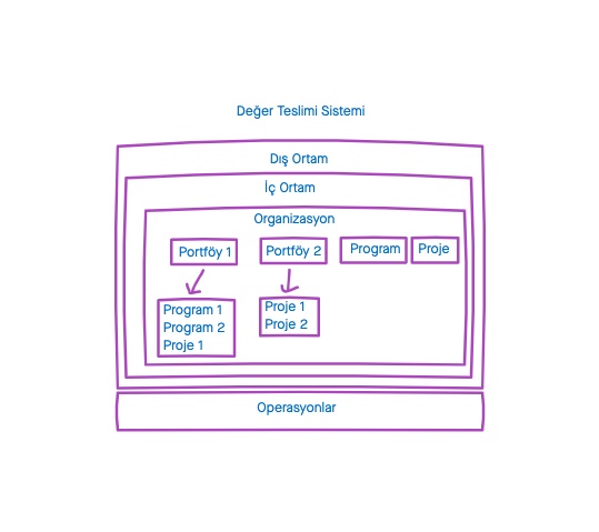 PMBOK 7 iki şekil üzerinde sistemi anlatmaya çalışmaktadır. Aynı grafiği küçük bir ekleme ile 2 kere kullanmaları pek akıllıca olmamış. Tek grafik üzerinde anlatmak gerekirse aşağıda 2 portföy, 1 program ve projeden oluşan bir yapı yer almaktadır. Portföyler, program ve projeleri içerirken, bağımsız program ve projeler olabilir. Operasyonlar, portföyleri, programları, projeleri, tedarik zinciri yönetimi vb. gibi diğer iş fonksiyonlarını doğrudan destekleyebilir ve etkileyebilirler. Portföyler, programlar ve projeler, operasyonların yanı sıra birbirlerini de etkileyebilirler.