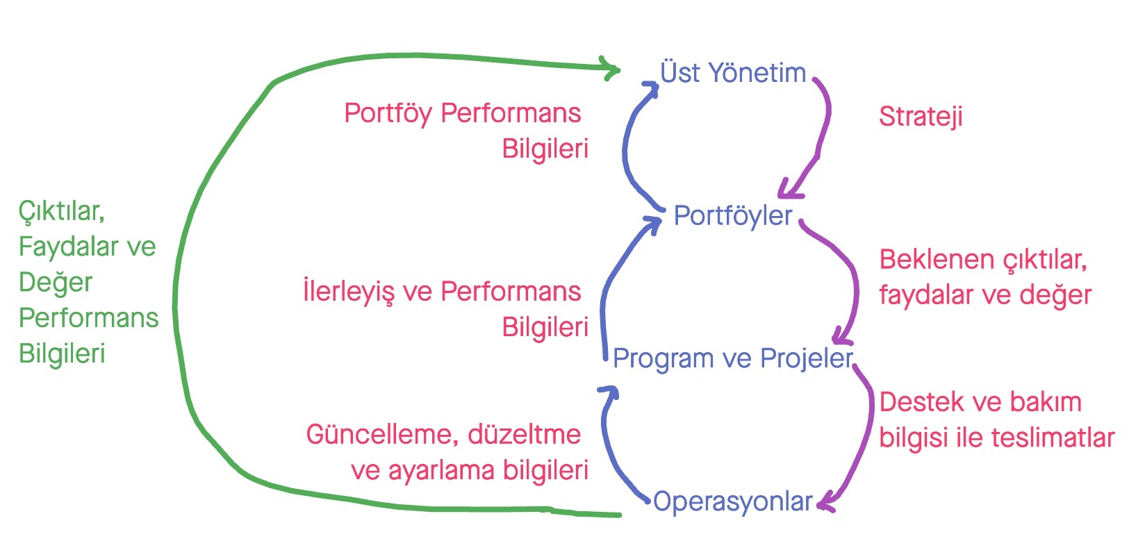 Aşağıdaki şekilde mor oklar üst yönetimin vizyon, misyon ve hedefler doğrultusunda belirlediği stratejileri portföylere, portföylerden programlara ve projelere ve ardından operasyonlara kadar akan bilgi akışı modelini göstermektedir. Üst yönetim, stratejik bilgileri portföylerle paylaşır. Portföyler, istenen sonuçları, faydaları ve değeri programlar ve projelerle paylaşır. Programlardan ve projelerden elde edilen teslimatlar, destek ve bakım bilgileriyle birlikte operasyonlara iletilir.