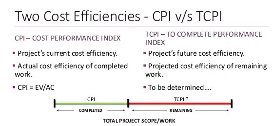 - Tamamlama için Gerekli Performans Endeksi (To Complete Performance Index – TCPI) – Belirli yönetim hedefini karşılamak için gereken maliyet performansını tahmin eden kazanılmış değer yönetimi ölçüsüdür. TCPI, bekleyen işi bitirme maliyetinin kalan bütçeye oranı olarak ifade edilir.