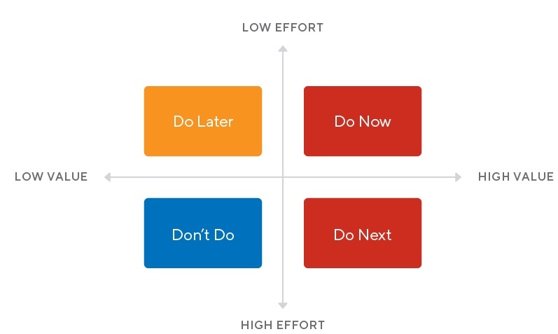 - Önceliklendirme Matrisi – Öğeleri önceliğe göre sınıflandırmak için dört çeyreğe bölünmüş, yatay eksende eforun ve dikey eksende değerin gösterildiği bir dağılım diyagramıdır.