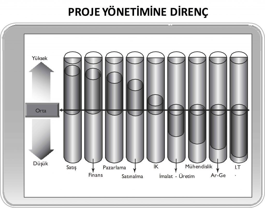 Yukarıdaki grafikte yapılan bir araştırmanın sonuçları şöyle özetlenmiş; Satış, proje başarılarını kendi başarılarına rakip olarak görüyor. Pazarlama, proje yöneticilerinin müşteriye çok fazla yaklaştığını düşünüyor. Finans vb. departmanlar kazanılmış değer gibi analizlerle performanslarının ortaya çıkmasından çekiniyor. Satınalma, merkezi satınalmanın projeye kayacağından çekiniyor. İK, şirkete katacağı değeri öngöremiyormuş. İmalat, Üretim, Ar-Ge ve IT değer yarattığını ve stratejik bir gereklilik olduğunu düşünüyormuş.